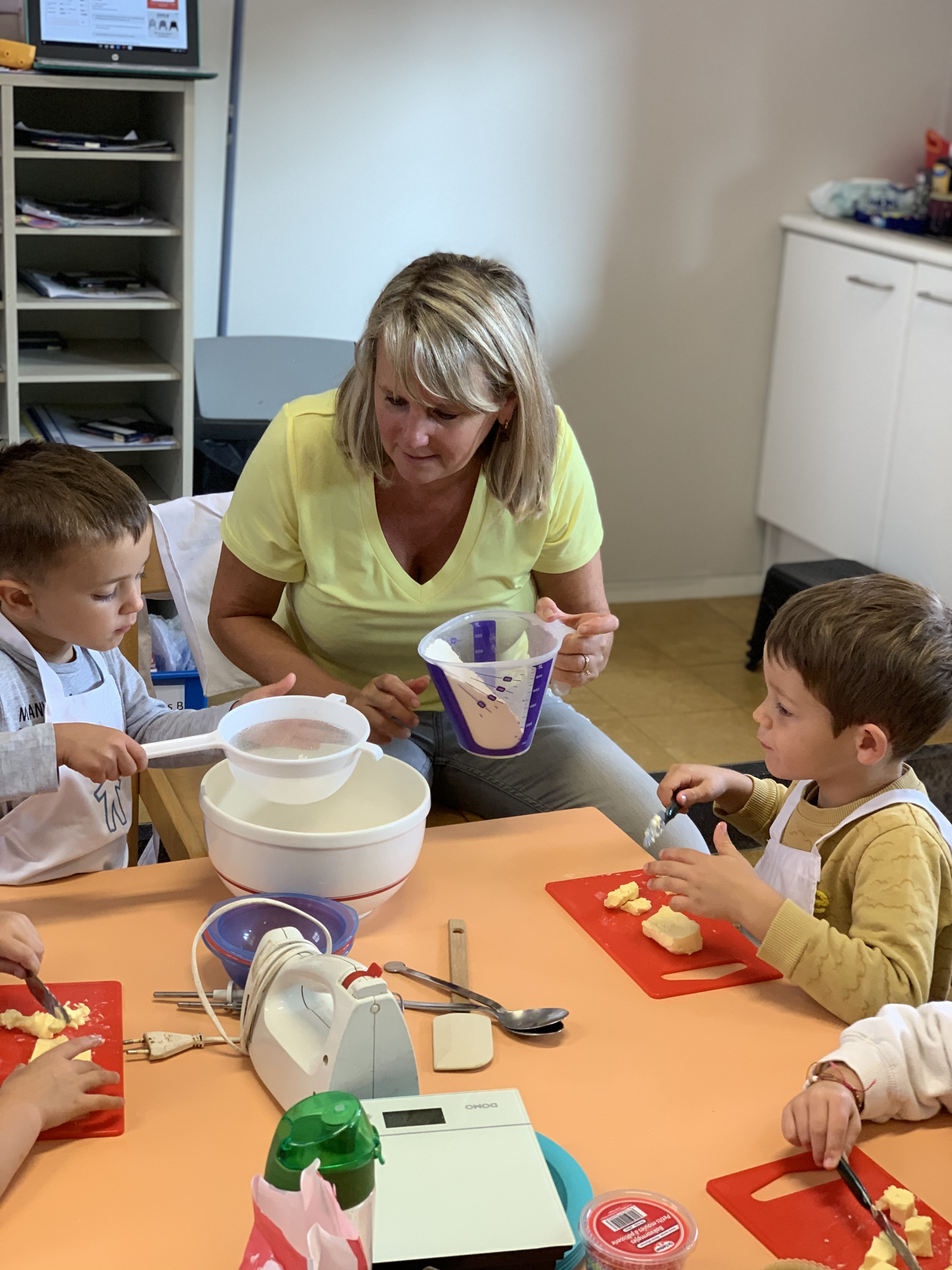 De mama van juf Emma kwam ons wat helpen om te bakken. "Huh, heeft de juf een mama?!?!"